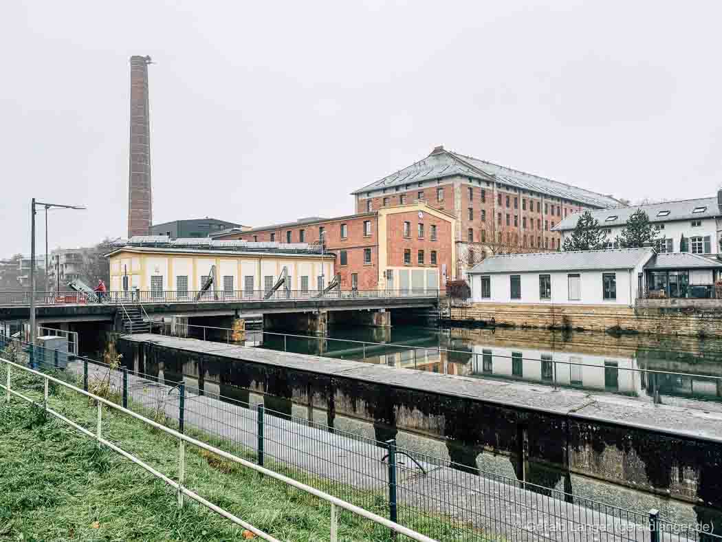 Ausgangspunkt war hier die ehemalige Baumwollspinnerei Erlangen‑Bamberg, deren Produktionsbetrieb bereits 1993 eingestellt wurde und die über Jahre als weitgehend ungenutzte Industriebrache auf einer Flussinsel zwischen Regnitz und Main‑Donau‑Kanal lag.